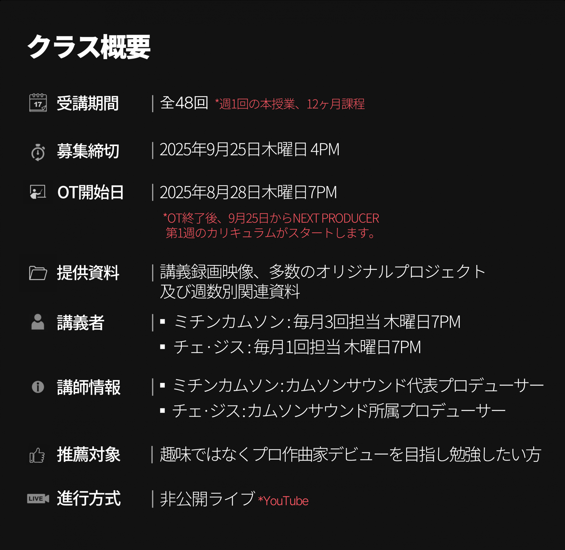 内線番号 | 1 - クラスに関するお問い合わせ 2 - 支払いに関するお問い合わせ 3 - 資料発送および技術チームへの接続 4 - マーケティングに関するお問い合わせ 5 - オペレーター接続およびその他のお問い合わせは カムソンサウンドのKAKAO・LINEチャンネルをご利用ください | ||