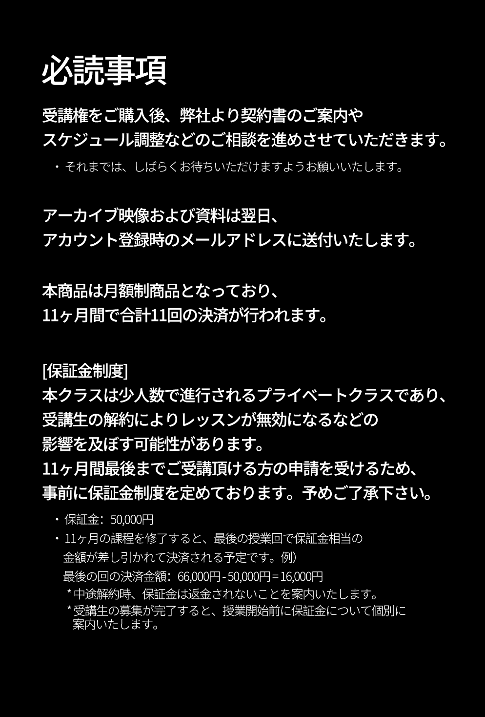 ► クラス開始前まで全額払い戻し可能(ただし、開始前に事前資料を受け取った場合は払い戻し不可)