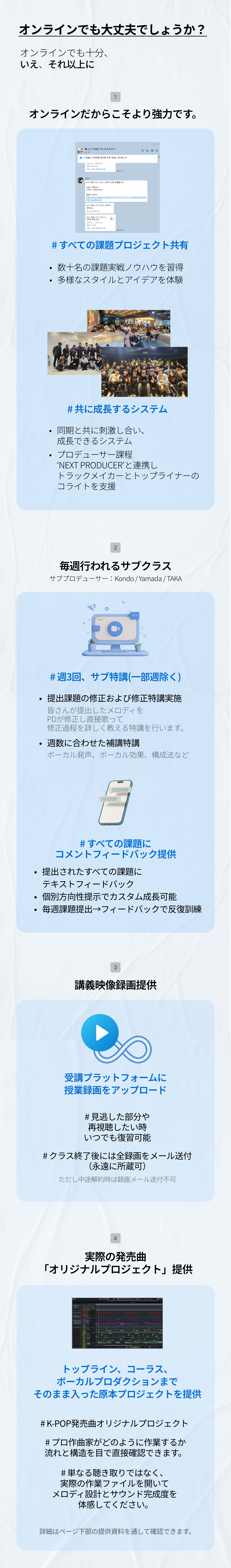 内線番号 | 1 - クラスに関するお問い合わせ 2 - 支払いに関するお問い合わせ 3 - 資料発送および技術チームへの接続 4 - マーケティングに関するお問い合わせ 5 - オペレーター接続およびその他のお問い合わせは カムソンサウンドのKAKAO・LINEチャンネルをご利用ください | ||