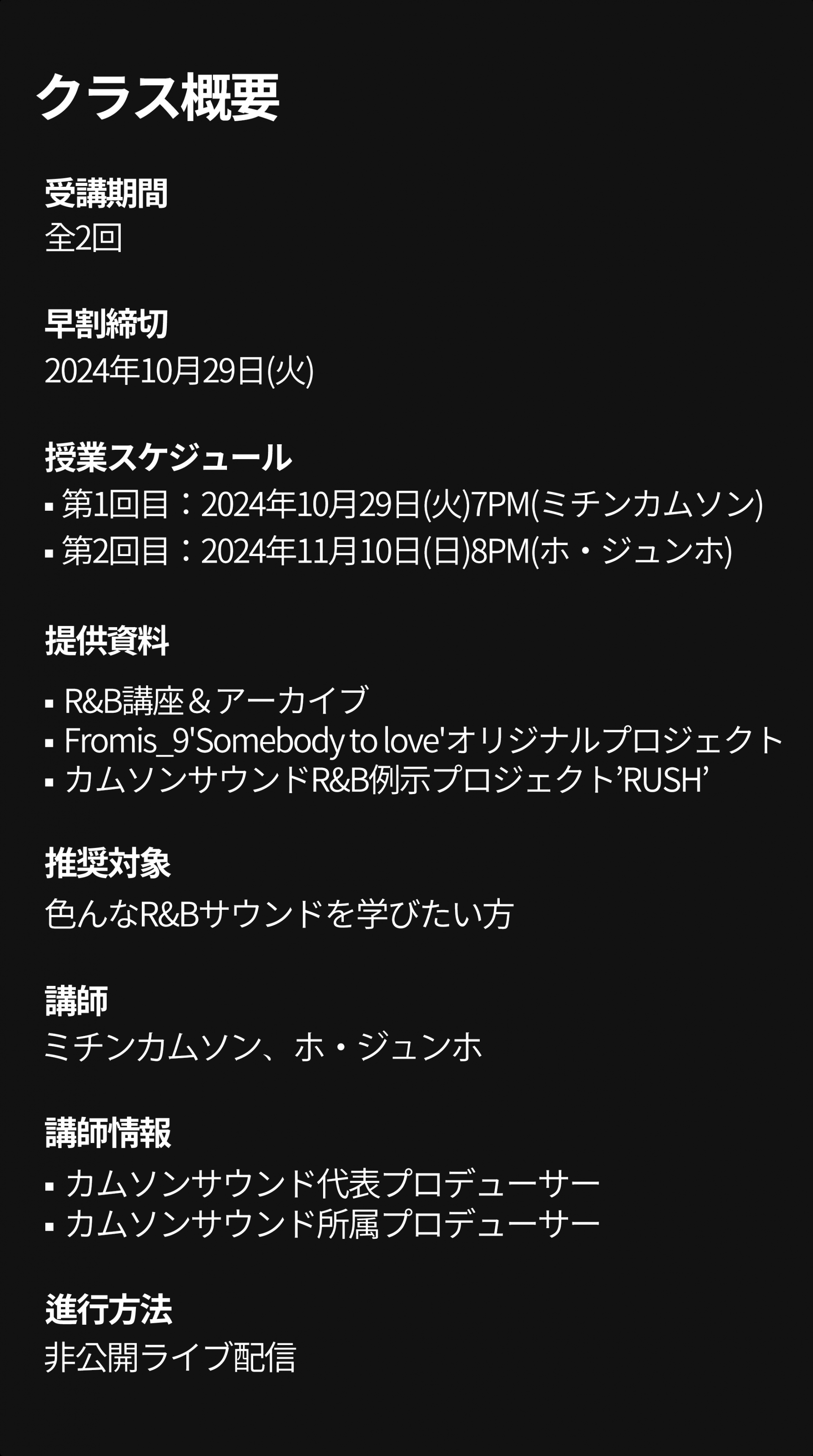 内線番号 | 1 - クラスに関するお問い合わせ 2 - 支払いに関するお問い合わせ 3 - 資料発送および技術チームへの接続 4 - マーケティングに関するお問い合わせ 5 - オペレーター接続およびその他のお問い合わせは カムソンサウンドのKAKAO・LINEチャンネルをご利用ください | ||