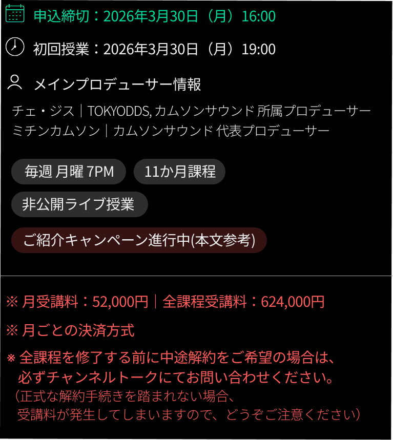 内線番号 | 1 - クラスに関するお問い合わせ 2 - 支払いに関するお問い合わせ 3 - 資料発送および技術チームへの接続 4 - マーケティングに関するお問い合わせ 5 - オペレーター接続およびその他のお問い合わせは カムソンサウンドのKAKAO・LINEチャンネルをご利用ください | ||